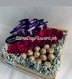 Discover the perfect harmony of sweetness and elegance. Enjoy premium chocolates paired with fresh and beautiful blooms, exclusively available at SameDayFlowers.pk. This delightful combo makes an ideal Chocolate And Flower Arrangements Pakistan